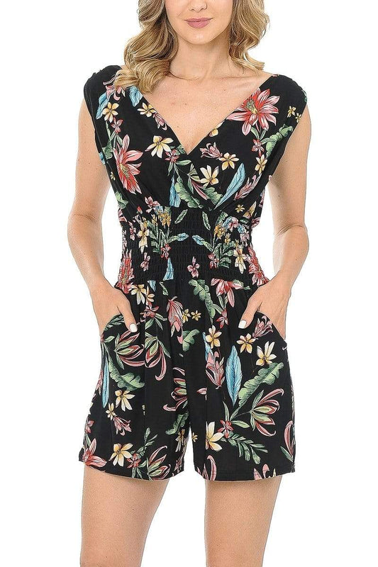 Auliné Collection Womens Sleeveless Front Back Wide V-Neck Short Jumpsuit Romper