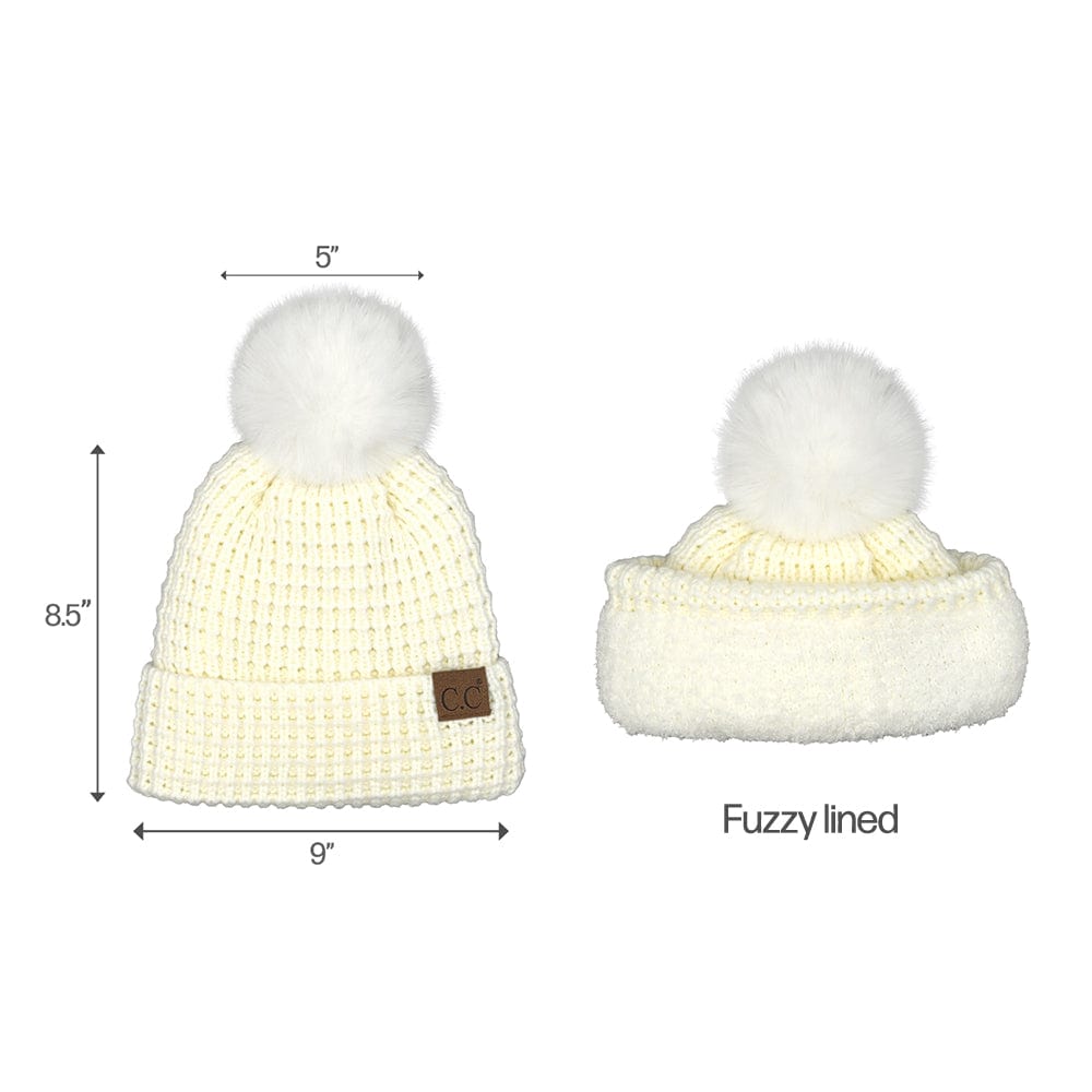 C.C Waffle Knit Pattern Cuff Beanie for Women – Soft Winter Warm Hat with Faux Fur Pom - HTE 0032